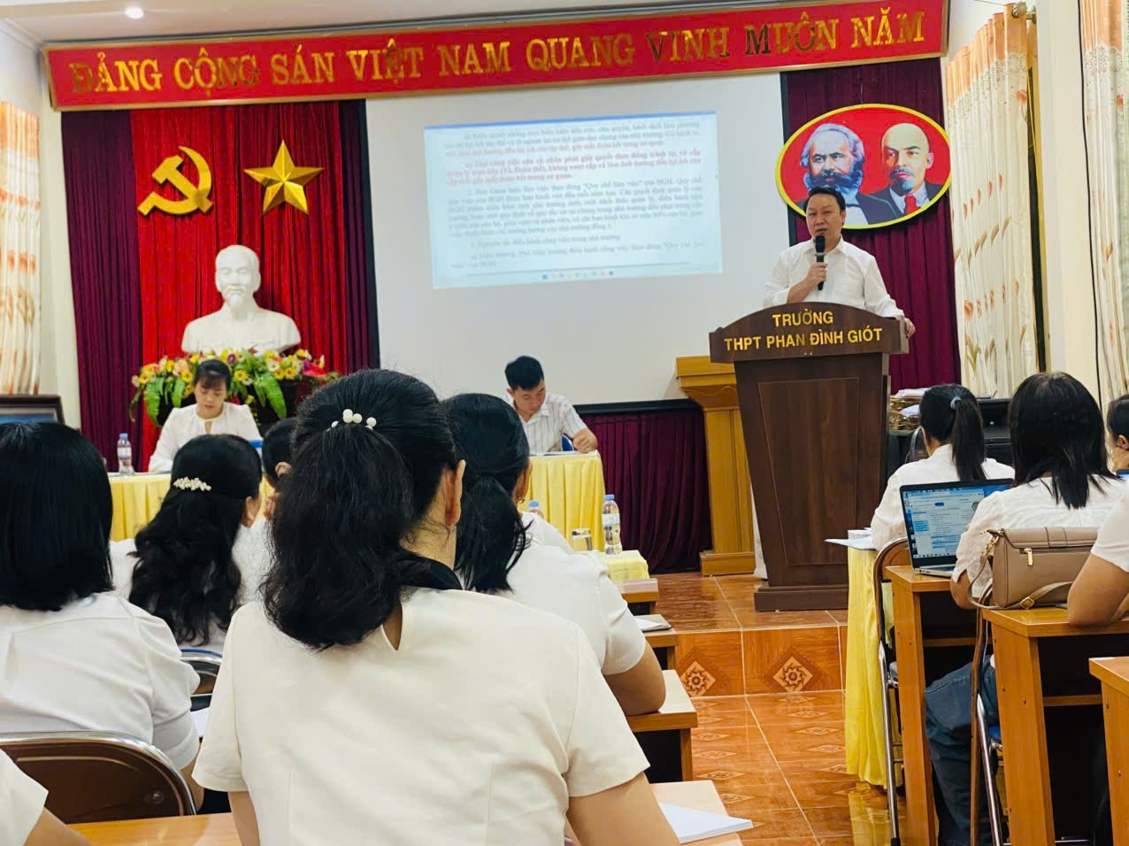 Sáng ngày 23 tháng 9 năm 2025, trường THPT Phan Đình Giót đã tổ chức Hội nghị đầu năm học 2025-2026, nhằm đánh giá tình hình hoạt động của nhà trường trong năm học vừa qua, đồng thời đề ra các mục tiêu và phương hướng thực hiện trong năm học mới. Hội nghị có sự tham gia của Ban giám hiệu, các thầy cô giáo, cán bộ nhân viên nhà trường.