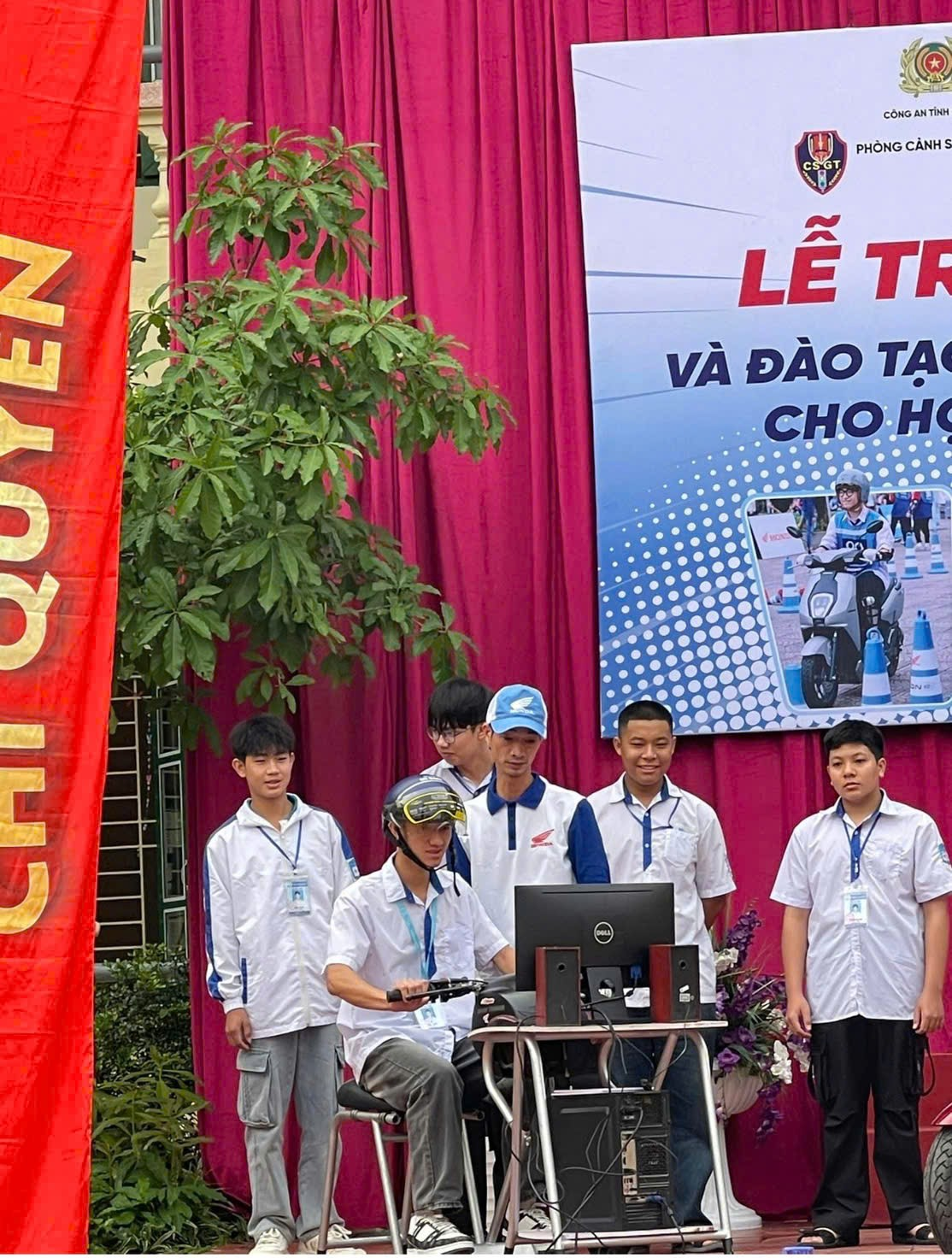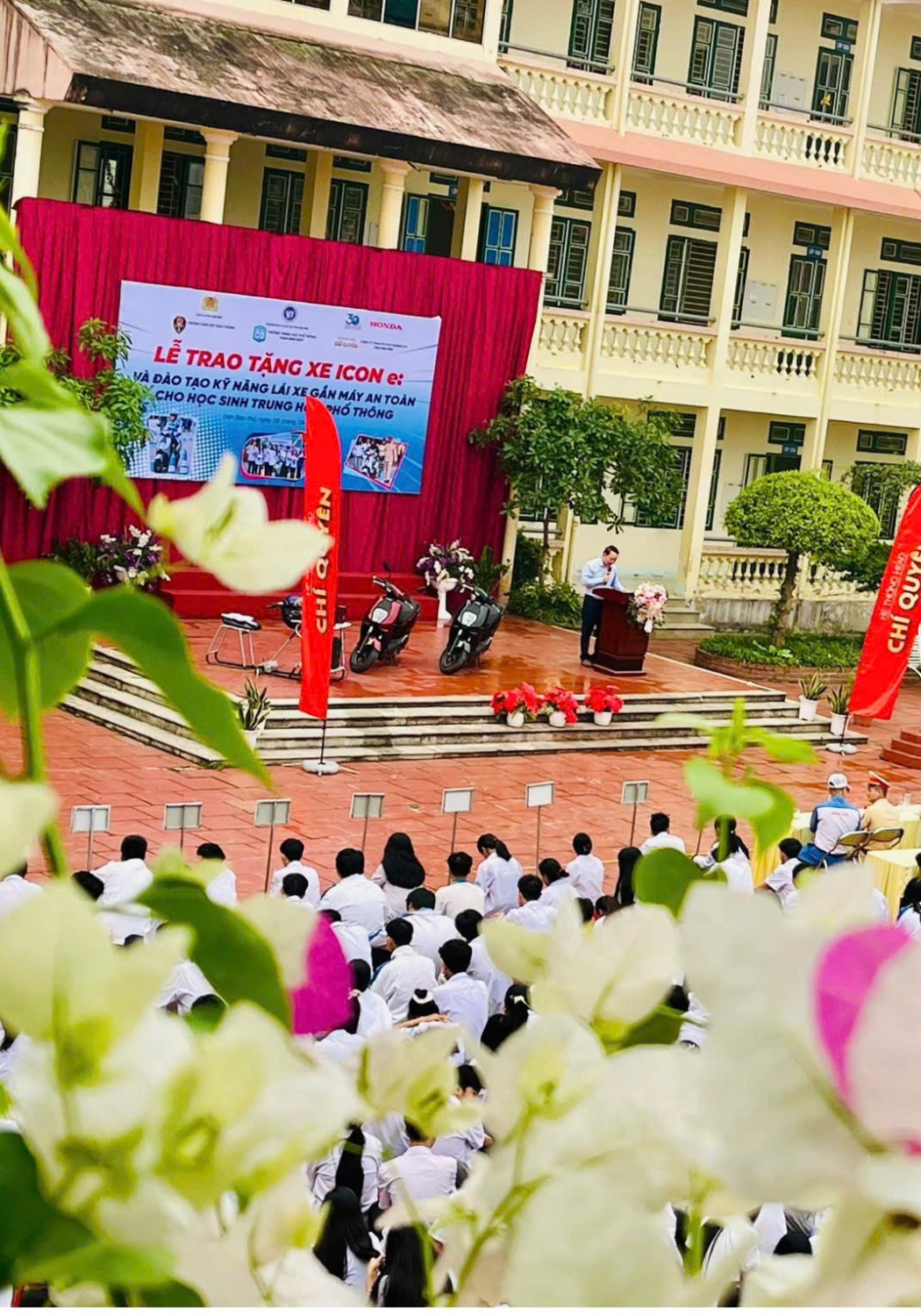 May be an image of one or more people and text that says 'INONEIS LỄ TRAO TĂNG XE ICON ះ VÀ DÀO TAO KỲ NĂNG LÁIXE GÁN MÁY TOAN CHO cHoHcBuTauHKcMocepHoTHoH Hoc SINH TRUNG HỌC PHÓ THÔNG MIRM'