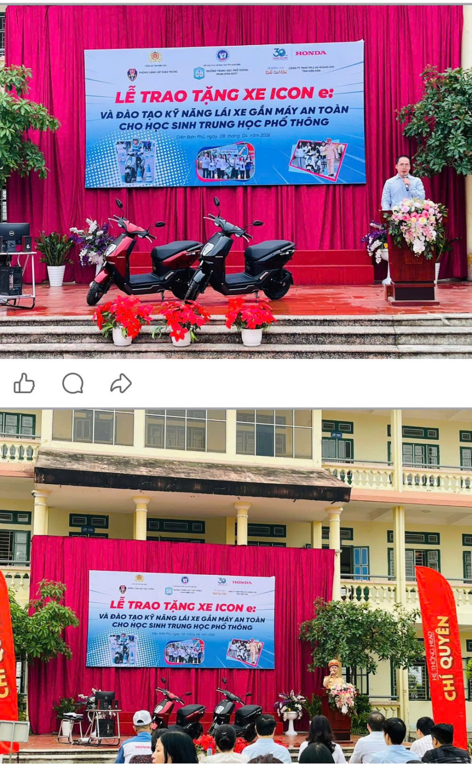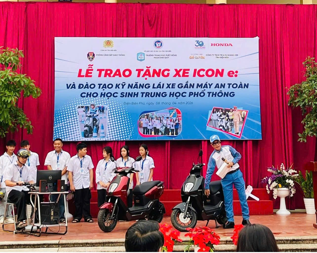 Sáng 08/4/2026, Trường THPT Phan Đình Giót phối hợp với Phòng CSGT Công an tỉnh Điện Biên và HEAD Chí Quyên tổ chức chương trình trao tặng xe máy điện ICON e ⚡ và tuyên truyền, hướng dẫn kỹ năng lái xe an toàn cho học sinh.